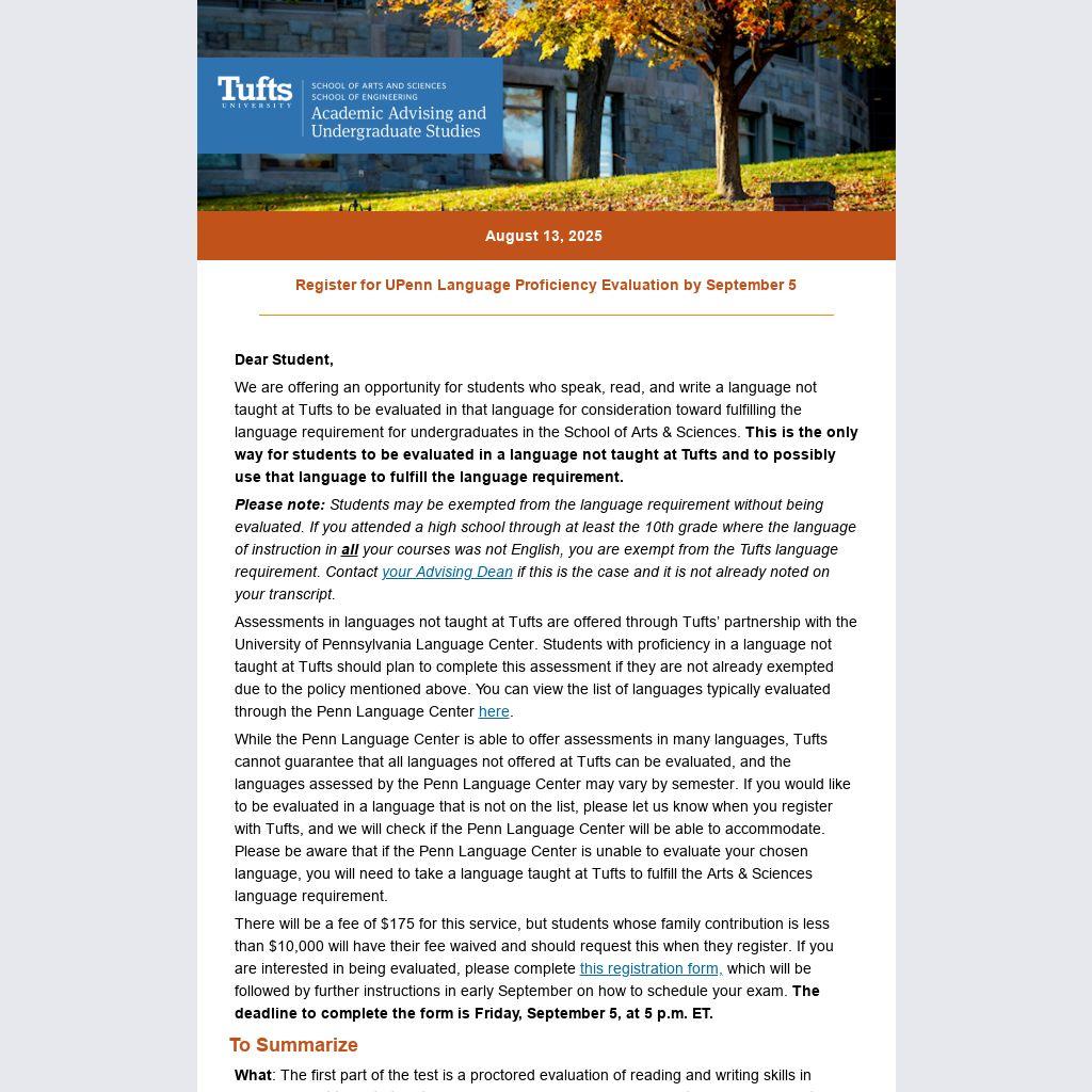Please note: Students may be exempted from the language requirement without being evaluated. If you attended a high school through at least the 10th grade where the language of instruction in all your courses was not English, you are exempt from the Tufts language requirement. Contact your Advising Dean if this is the case and it is not already noted on your transcript.