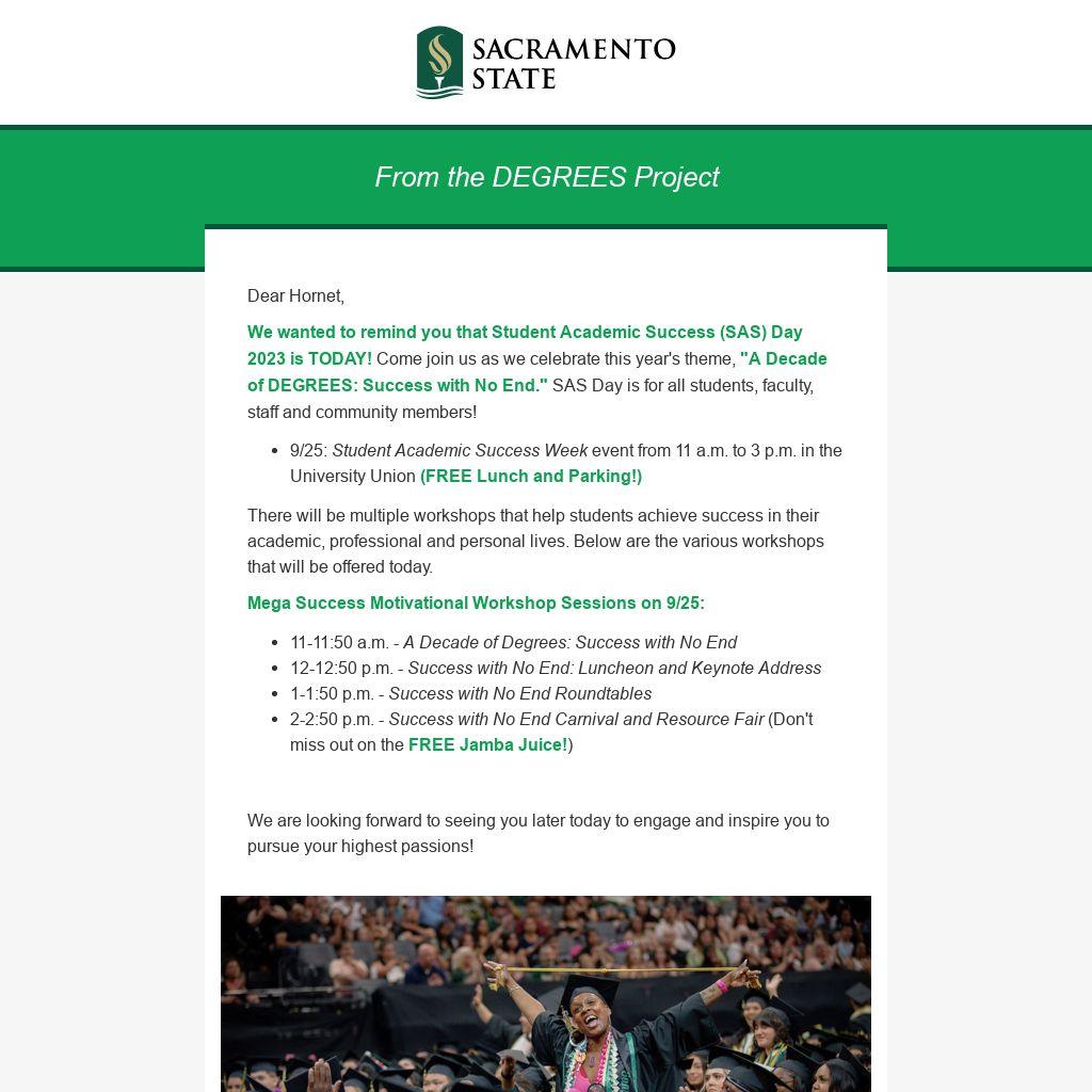 We wanted to remind you that Student Academic Success (SAS) Day 2023 is TODAY! Come join us as we celebrate this year's theme, "A Decade of DEGREES: Success with No End." SAS Day is for all students, faculty, staff and community members!