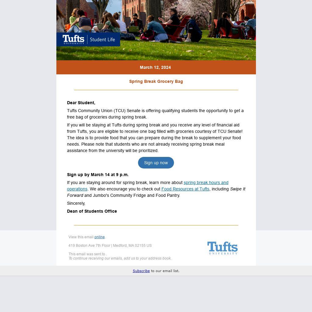 If you will be staying at Tufts during spring break and you receive any level of financial aid from Tufts, you are eligible to receive one bag filled with groceries courtesy of TCU Senate! The idea is to provide food that you can prepare during the break to supplement your food needs. Please note that students who are not already receiving spring break meal assistance from the university will be prioritized.