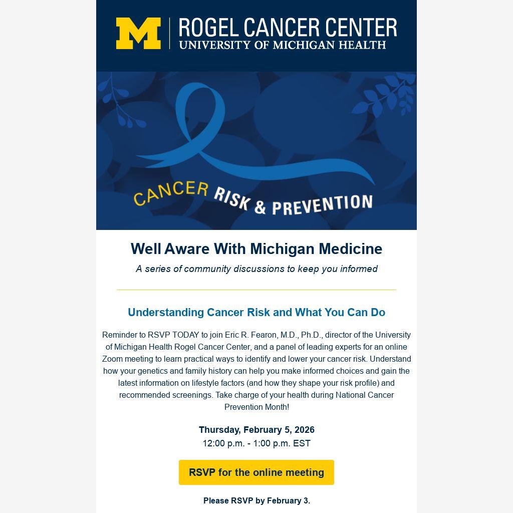 Reminder to RSVP TODAY to join Eric R. Fearon, M.D., Ph.D., director of the University of Michigan Health Rogel Cancer Center, and a panel of leading experts for an online Zoom meeting to learn practical ways to identify and lower your cancer risk. Understand how your genetics and family history can help you make informed choices and gain the latest information on lifestyle factors (and how they shape your risk profile) and recommended screenings. Take charge of your health during National Cancer Prevention Month!