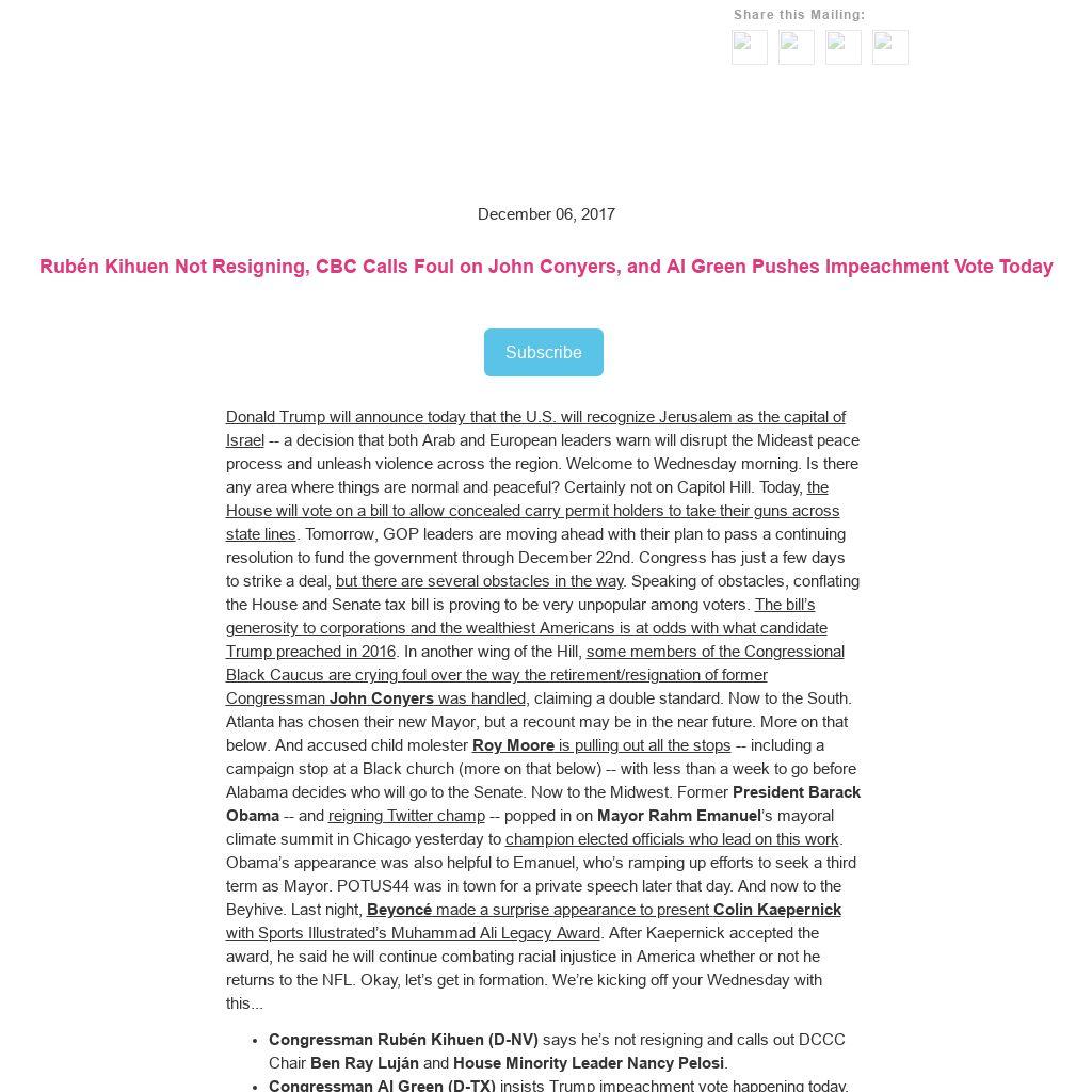 Donald Trump will announce today that the U.S. will recognize Jerusalem as the capital of Israel -- a decision that both Arab and European leaders warn will disrupt the Mideast peace process and unleash violence across the region. Welcome to Wednesday morning. Is there any area where things are normal and peaceful? Certainly not on Capitol Hill. Today, the House will vote on a bill to allow concealed carry permit holders to take their guns across state lines. Tomorrow, GOP leaders are moving ahead with their plan to pass a continuing resolution to fund the government through December 22nd. Congress has just a few days to strike a deal, but there are several obstacles in the way. Speaking of obstacles, conflating the House and Senate tax bill is proving to be very unpopular among voters. The bill’s generosity to corporations and the wealthiest Americans is at odds with what candidate Trump preached in 2016. In another wing of the Hill, some members of the Congressional Black Caucus are crying foul over the way the retirement/resignation of former Congressman John Conyers was handled, claiming a double standard. Now to the South. Atlanta has chosen their new Mayor, but a recount may be in the near future. More on that below. And accused child molester Roy Moore is pulling out all the stops -- including a campaign stop at a Black church (more on that below) -- with less than a week to go before Alabama decides who will go to the Senate. Now to the Midwest. Former President Barack Obama -- and reigning Twitter champ -- popped in on Mayor Rahm Emanuel’s mayoral climate summit in Chicago yesterday to champion elected officials who lead on this work. Obama’s appearance was also helpful to Emanuel, who’s ramping up efforts to seek a third term as Mayor. POTUS44 was in town for a private speech later that day. And now to the Beyhive. Last night, Beyoncé made a surprise appearance to present Colin Kaepernick with Sports Illustrated’s Muhammad Ali Legacy Award. After Kaepernick accepted the award, he said he will continue combating racial injustice in America whether or not he returns to the NFL. Okay, let’s get in formation. We’re kicking off your Wednesday with this...