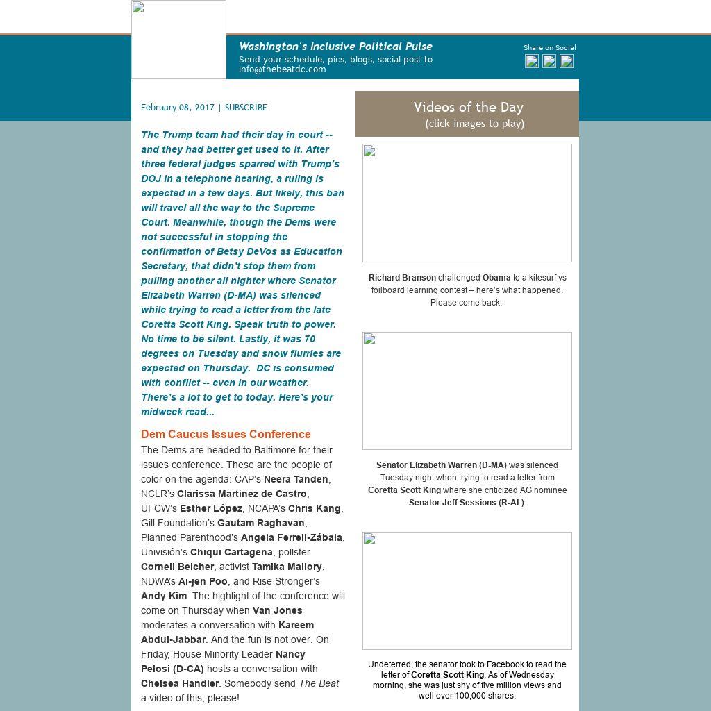 The Trump team had their day in court -- and they had better get used to it. After three federal judges sparred with Trump’s DOJ in a telephone hearing, a ruling is expected in a few days. But likely, this ban will travel all the way to the Supreme Court. Meanwhile, though the Dems were not successful in stopping the confirmation of Betsy DeVos as Education Secretary, that didn’t stop them from pulling another all nighter where Senator Elizabeth Warren (D-MA) was silenced while trying to read a letter from the late Coretta Scott King. Speak truth to power. No time to be silent. Lastly, it was 70 degrees on Tuesday and snow flurries are expected on Thursday. DC is consumed with conflict -- even in our weather. There’s a lot to get to today. Here’s your midweek read...