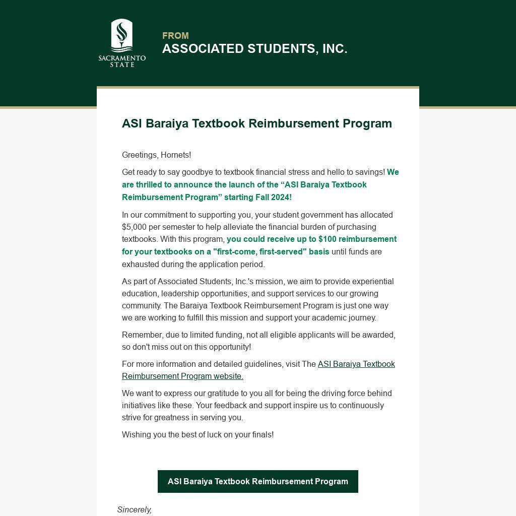 As part of Associated Students, Inc.'s mission, we aim to provide experiential education, leadership opportunities, and support services to our growing community. The Baraiya Textbook Reimbursement Program is just one way we are working to fulfill this mission and support your academic journey.