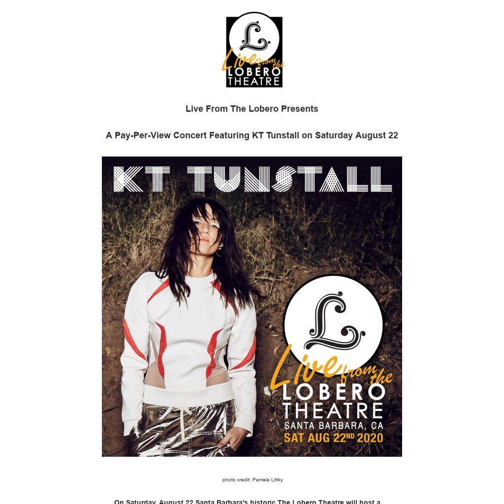 On Saturday, August 22 Santa Barbara's historic The Lobero Theatre will host a special pay-per-view concert featuring KT Tunstall. The live streamed performance is the second show in The Lobero's series of specially-priced, live streamed concerts which take place without an audience, with strict safety and COVID-19 sanitation protocols in place.