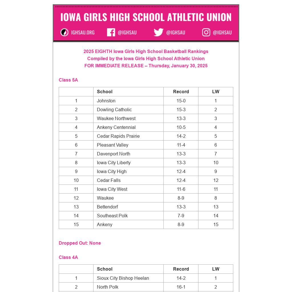 2025 EIGHTH Iowa Girls High School Basketball Rankings