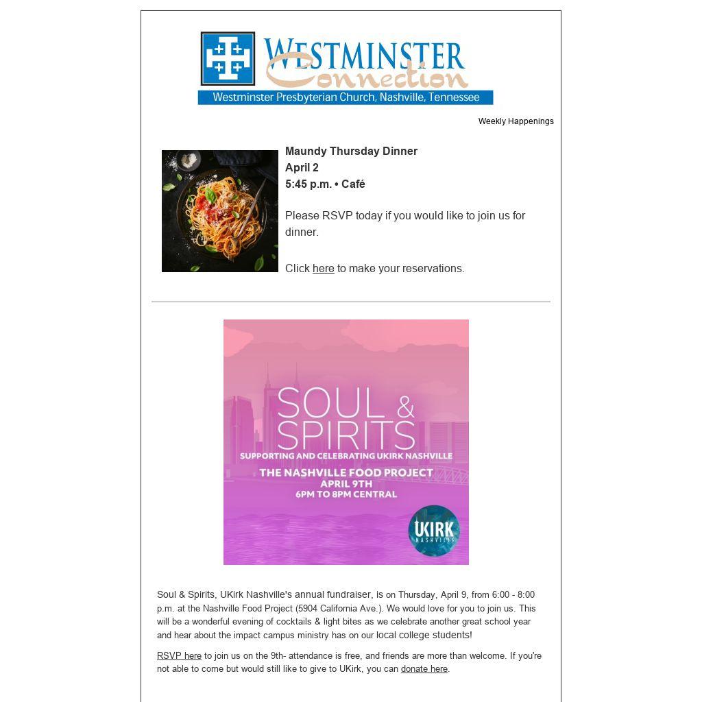 Soul & Spirits, UKirk Nashville's annual fundraiser, is on Thursday, April 9, from 6:00 - 8:00 p.m. at the Nashville Food Project (5904 California Ave.). We would love for you to join us. This will be a wonderful evening of cocktails & light bites as we celebrate another great school year and hear about the impact campus ministry has on our local college students!