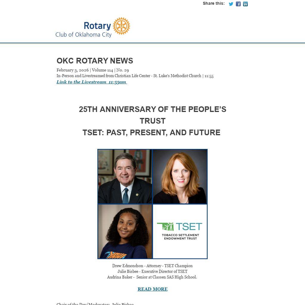 February 10, 2026 - Rotary Afterhours March 10, 2026 - Rotary Afterhours April 4, 2026 - Pickleball Tournament (rescheduled) April 21, 2026 - Tulsa Rotarians visit Club 29 June 2, 2026 - Car Show June 30, 2026 - Inaugural of the 2026-2027 Officers & Directors, Lance McDaniel President
