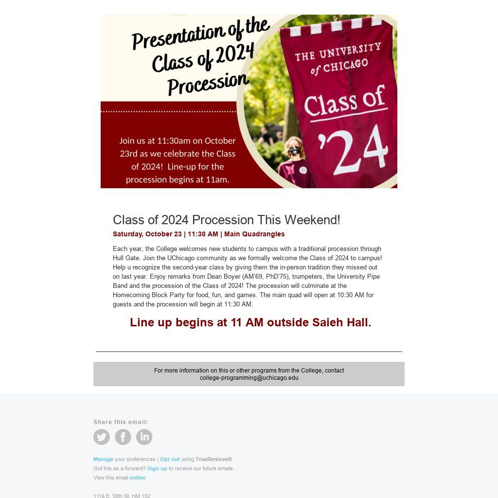 Each year, the College welcomes new students to campus with a traditional procession through Hull Gate. Join the UChicago community as we formally welcome the Class of 2024 to campus! Help u recognize the second-year class by giving them the in-person tradition they missed out on last year. Enjoy remarks from Dean Boyer (AM’69, PhD’75), trumpeters, the University Pipe Band and the procession of the Class of 2024! The procession will culminate at the Homecoming Block Party for food, fun, and games. The main quad will open at 10:30 AM for guests and the procession will begin at 11:30 AM.
