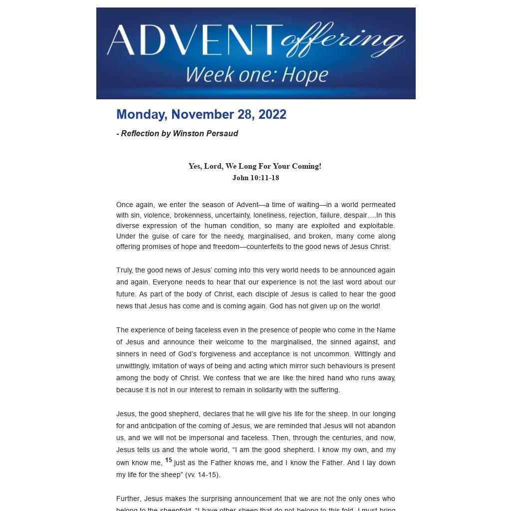 Prayer: O God, we give you thanks that Jesus, your Son, through the power of the Holy Spirit, willingly came into the world of sin and brokenness, of violence and death, that all may have life in him. In our remembering Jesus’ coming, we yearn for his coming again. In the Name of Jesus Christ, we pray. Amen.