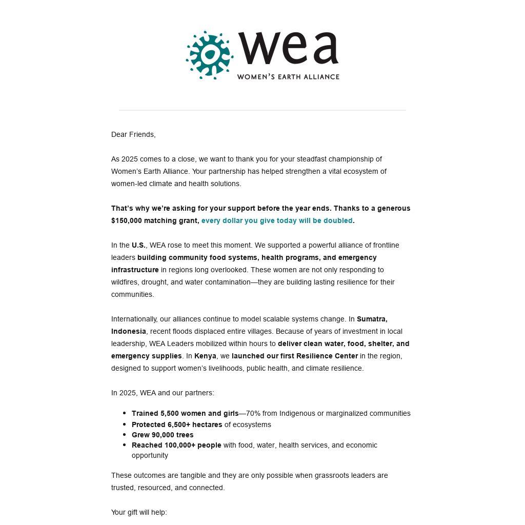 As 2025 comes to a close, we want to thank you for your steadfast championship of Women’s Earth Alliance. Your partnership has helped strengthen a vital ecosystem of women-led climate and health solutions.