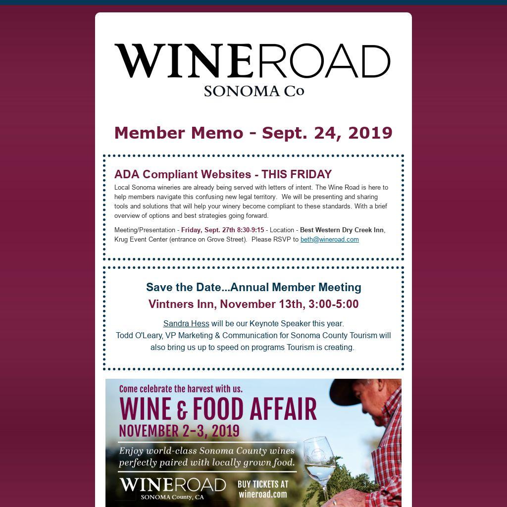 Meeting/Presentation - Friday, Sept. 27th 8:30-9:15- Location - Best Western Dry Creek Inn, Krug Event Center (entrance on Grove Street). Please RSVP to beth@wineroad.com