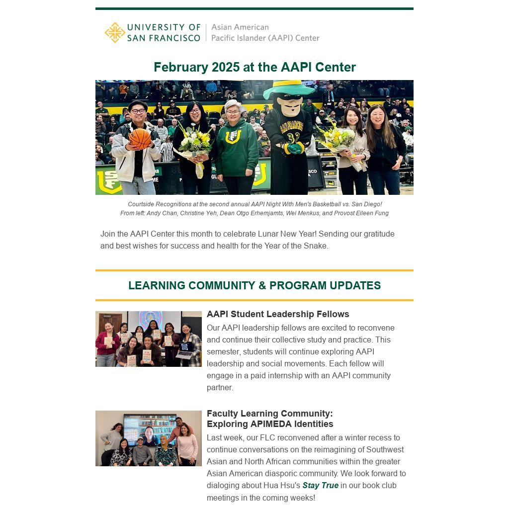In January, we welcomed the newest members of the USF community at Spring Orientation. The AAPI Center hosted a community celebration with over 200 AAPI faculty, staff, students, and alumni in attendance before the second annual AAPI Night With Men's Basketball (vs. San Diego). The month concluded with a spring welcome and community dinner for USF's Pacific Islander community!