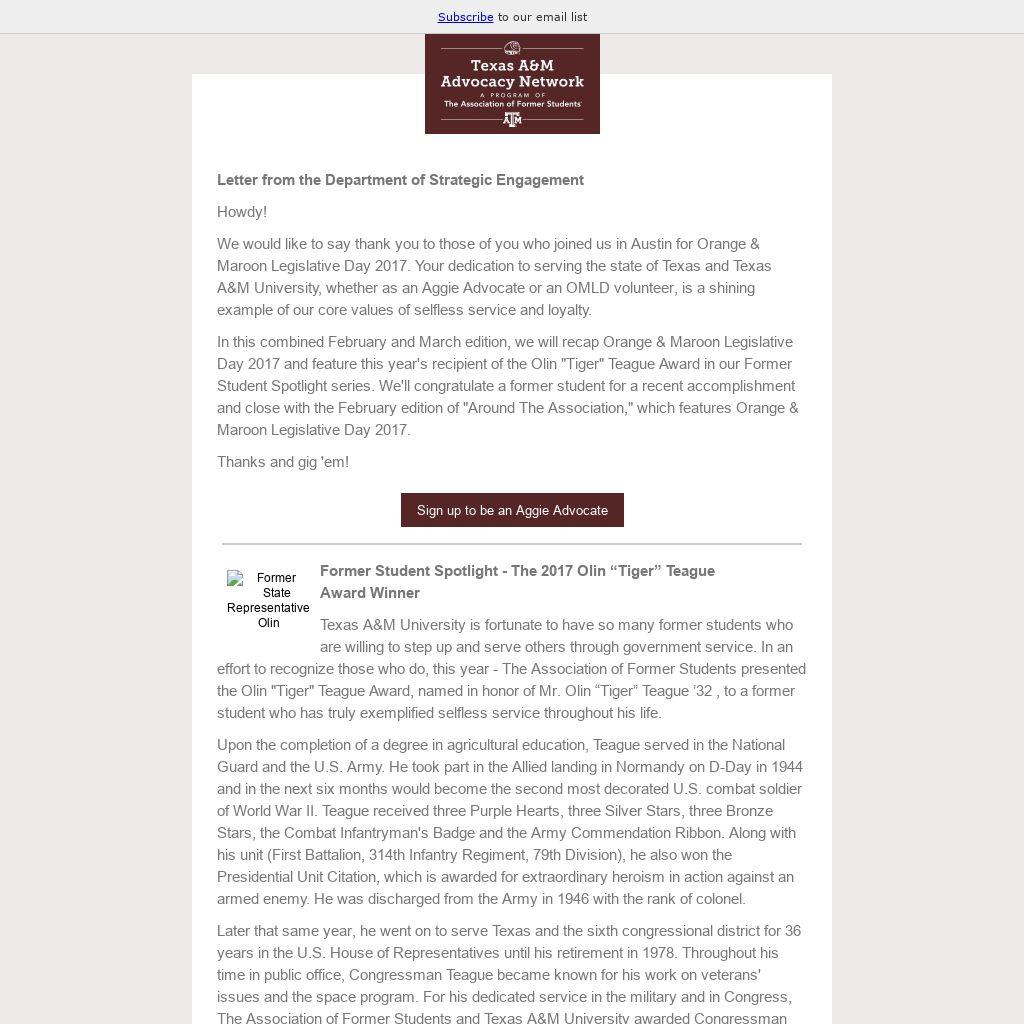 On February 15, The Association of Former Students was proud to host the eighth biennial Orange & Maroon Legislative Day in partnership with the Texas Exes. This event serves to bring together a grassroots network of current students, former students, and friends of Texas A&M University and The University of Texas at Austin to advocate for higher education in Texas. This year's event was our largest yet and we are happy to report that we had a successful trip to the Capitol.
