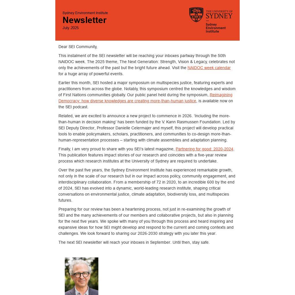 Finally, I am very proud to share with you SEI’s latest magazine, Partnering for good: 2020-2024. This publication features impact stories of our research and coincides with a five-year review process which research institutes at the University of Sydney are required to undertake.