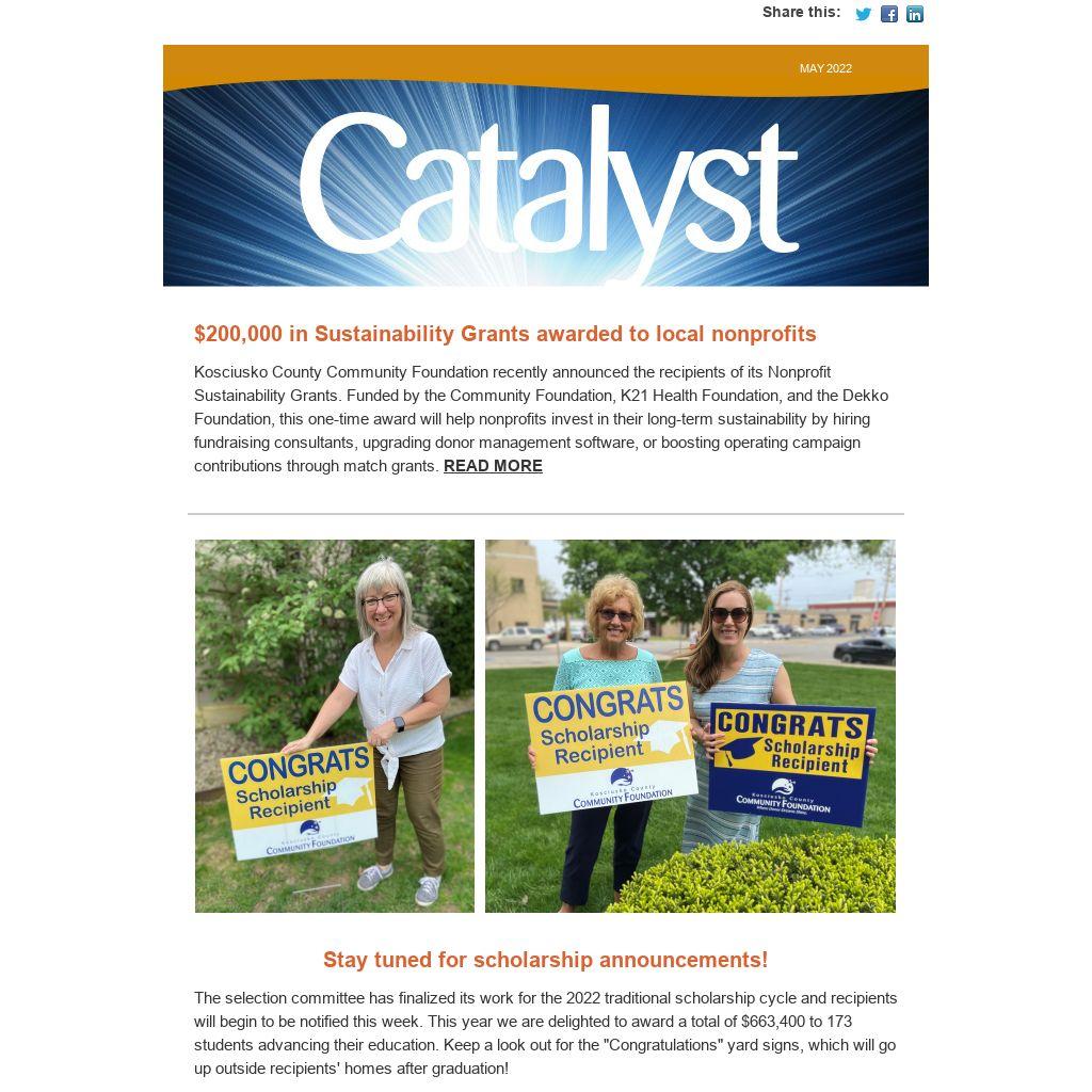 The selection committee has finalized its work for the 2022 traditional scholarship cycle and recipients will begin to be notified this week. This year we are delighted to award a total of $663,400 to 173 students advancing their education. Keep a look out for the "Congratulations" yard signs, which will go up outside recipients' homes after graduation!