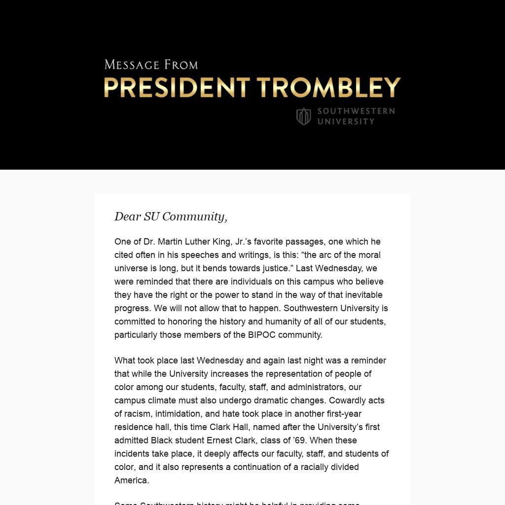 One of Dr. Martin Luther King, Jr.’s favorite passages, one which he cited often in his speeches and writings, is this: “the arc of the moral universe is long, but it bends towards justice.” Last Wednesday, we were reminded that there are individuals on this campus who believe they have the right or the power to stand in the way of that inevitable progress. We will not allow that to happen. Southwestern University is committed to honoring the history and humanity of all of our students, particularly those members of the BIPOC community.