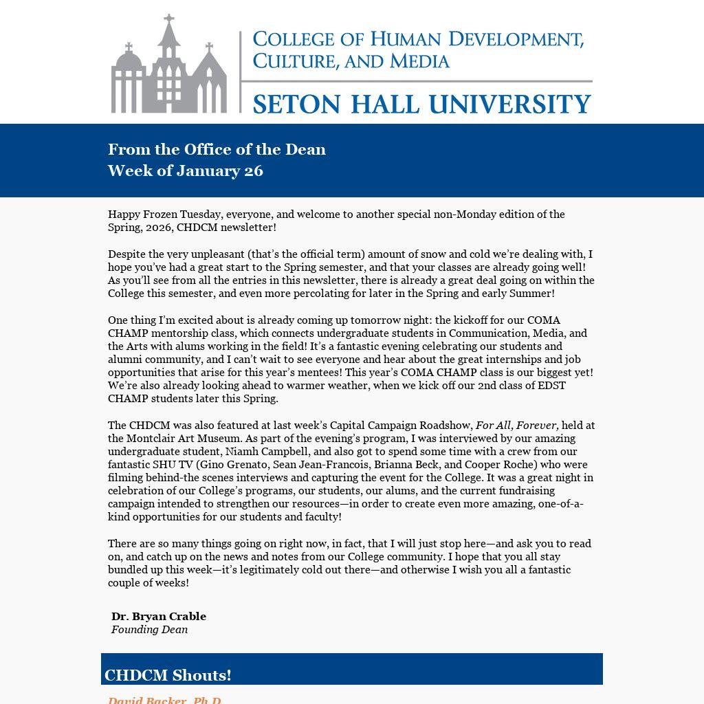One thing I’m excited about is already coming up tomorrow night: the kickoff for our COMA CHAMP mentorship class, which connects undergraduate students in Communication, Media, and the Arts with alums working in the field! It’s a fantastic evening celebrating our students and alumni community, and I can’t wait to see everyone and hear about the great internships and job opportunities that arise for this year’s mentees! This year’s COMA CHAMP class is our biggest yet! We’re also already looking ahead to warmer weather, when we kick off our 2nd class of EDST CHAMP students later this Spring.