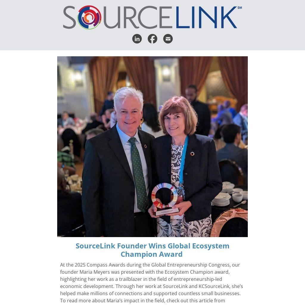 At the 2025 Compass Awards during the Global Entrepreneurship Congress, our founder Maria Meyers was presented with the Ecosystem Champion award, highlighting her work as a trailblazer in the field of entrepreneurship-led economic development. Through her work at SourceLink and KCSourceLink, she’s helped make millions of connections and supported countless small businesses. To read more about Maria’s impact in the field, check out this article from Startland News.
