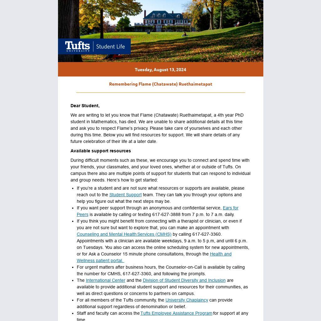 We are writing to let you know that Flame (Chatawate) Ruethaimetapat, a 4th year PhD student in Mathematics, has died. We are unable to share additional details at this time and ask you to respect Flame’s privacy. Please take care of yourselves and each other during this time. Below you will find resources for support. We will share details of any future celebration of their life at a later date.
