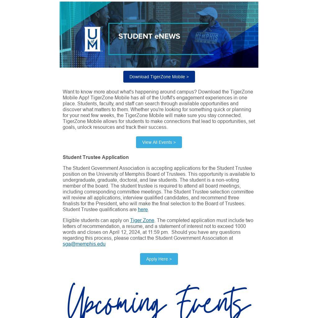 Want to know more about what's happening around campus? Download the TigerZone Mobile App! TigerZone Mobile has all of the UofM's engagement experiences in one place. Students, faculty, and staff can search through available opportunities and discover what matters to them. Whether you're looking for something quick or planning for your next few weeks, the TigerZone Mobile will make sure you stay connected. TigerZone Mobile allows for students to make connections that lead to opportunities, set goals, unlock resources and track their success.