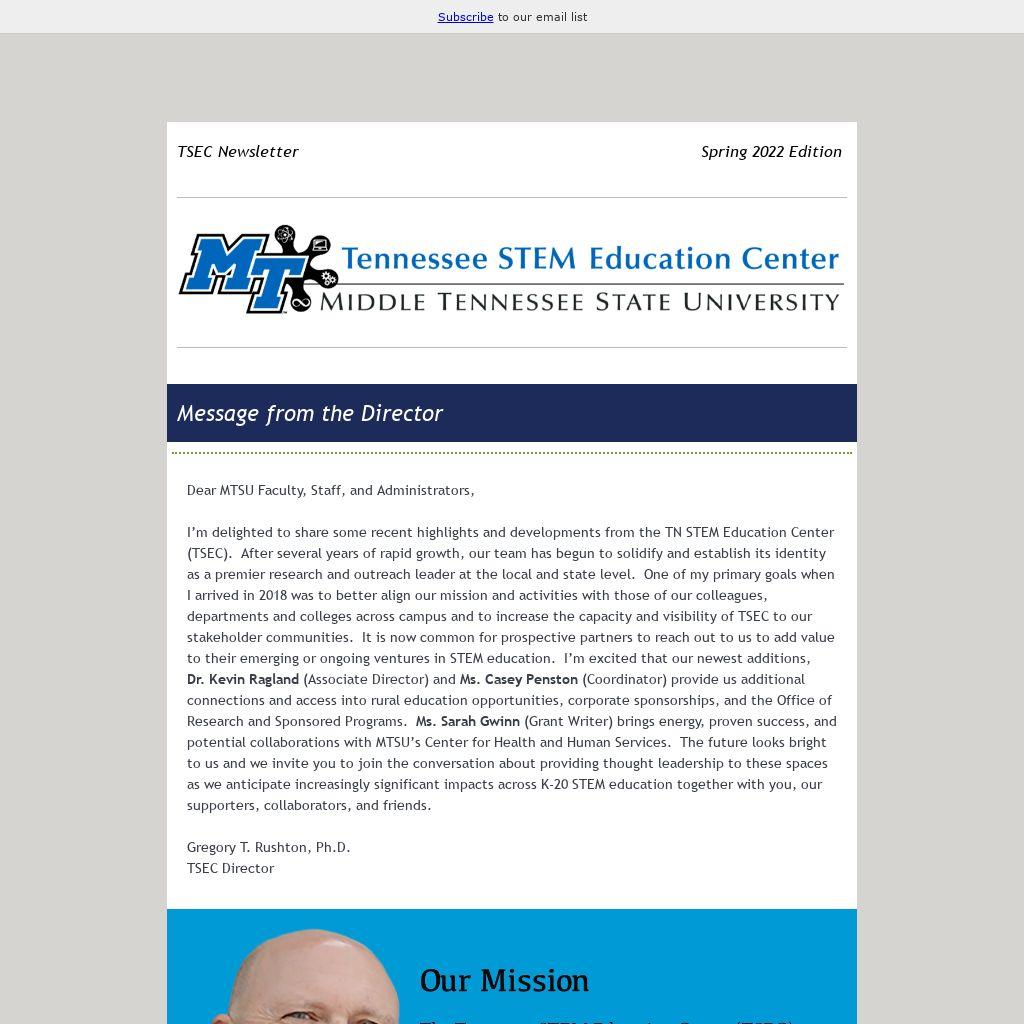 Dr. Kevin Ragland (Associate Director) and Ms. Casey Penston (Coordinator) provide us additional connections and access into rural education opportunities, corporate sponsorships, and the Office of Research and Sponsored Programs. Ms. Sarah Gwinn (Grant Writer) brings energy, proven success, and potential collaborations with MTSU’s Center for Health and Human Services. The future looks bright to us and we invite you to join the conversation about providing thought leadership to these spaces as we anticipate increasingly significant impacts across K-20 STEM education together with you, our supporters, collaborators, and friends.