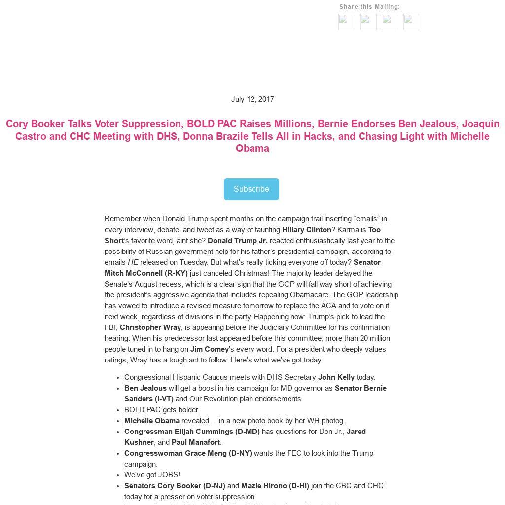 Remember when Donald Trump spent months on the campaign trail inserting “emails” in every interview, debate, and tweet as a way of taunting Hillary Clinton? Karma is Too Short’s favorite word, aint she? Donald Trump Jr. reacted enthusiastically last year to the possibility of Russian government help for his father’s presidential campaign, according to emails HE released on Tuesday. But what’s really ticking everyone off today? Senator Mitch McConnell (R-KY) just canceled Christmas! The majority leader delayed the Senate’s August recess, which is a clear sign that the GOP will fall way short of achieving the president’s aggressive agenda that includes repealing Obamacare. The GOP leadership has vowed to introduce a revised measure tomorrow to replace the ACA and to vote on it next week, regardless of divisions in the party. Happening now: Trump’s pick to lead the FBI, Christopher Wray, is appearing before the Judiciary Committee for his confirmation hearing. When his predecessor last appeared before this committee, more than 20 million people tuned in to hang on Jim Comey’s every word. For a president who deeply values ratings, Wray has a tough act to follow. Here’s what we’ve got today:- Congressional Hispanic Caucus meets with DHS Secretary John Kelly today.