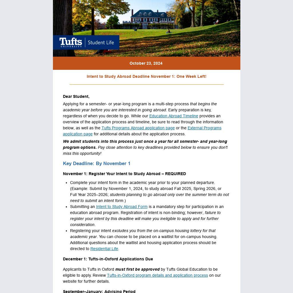 - Submit your application no later than February 1, 2025, to study abroad in Fall 2025, Spring 2026, or the Full Academic Year 2025–2026 for Tufts Programs Abroad and External Programs.