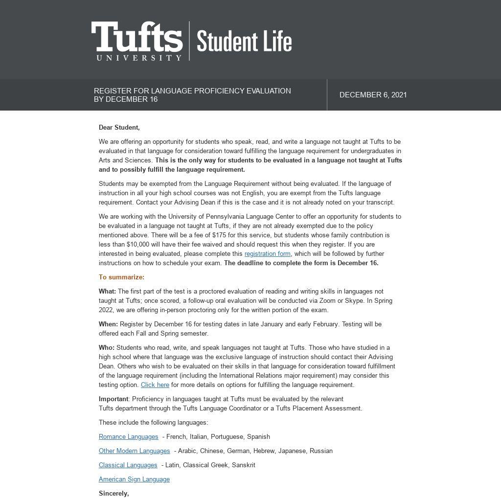 We are working with the University of Pennsylvania Language Center to offer an opportunity for students to be evaluated in a language not taught at Tufts, if they are not already exempted due to the policy mentioned above. There will be a fee of $175 for this service, but students whose family contribution is less than $10,000 will have their fee waived and should request this when they register. If you are interested in being evaluated, please complete this registration form, which will be followed by further instructions on how to schedule your exam. The deadline to complete the form is December 16.