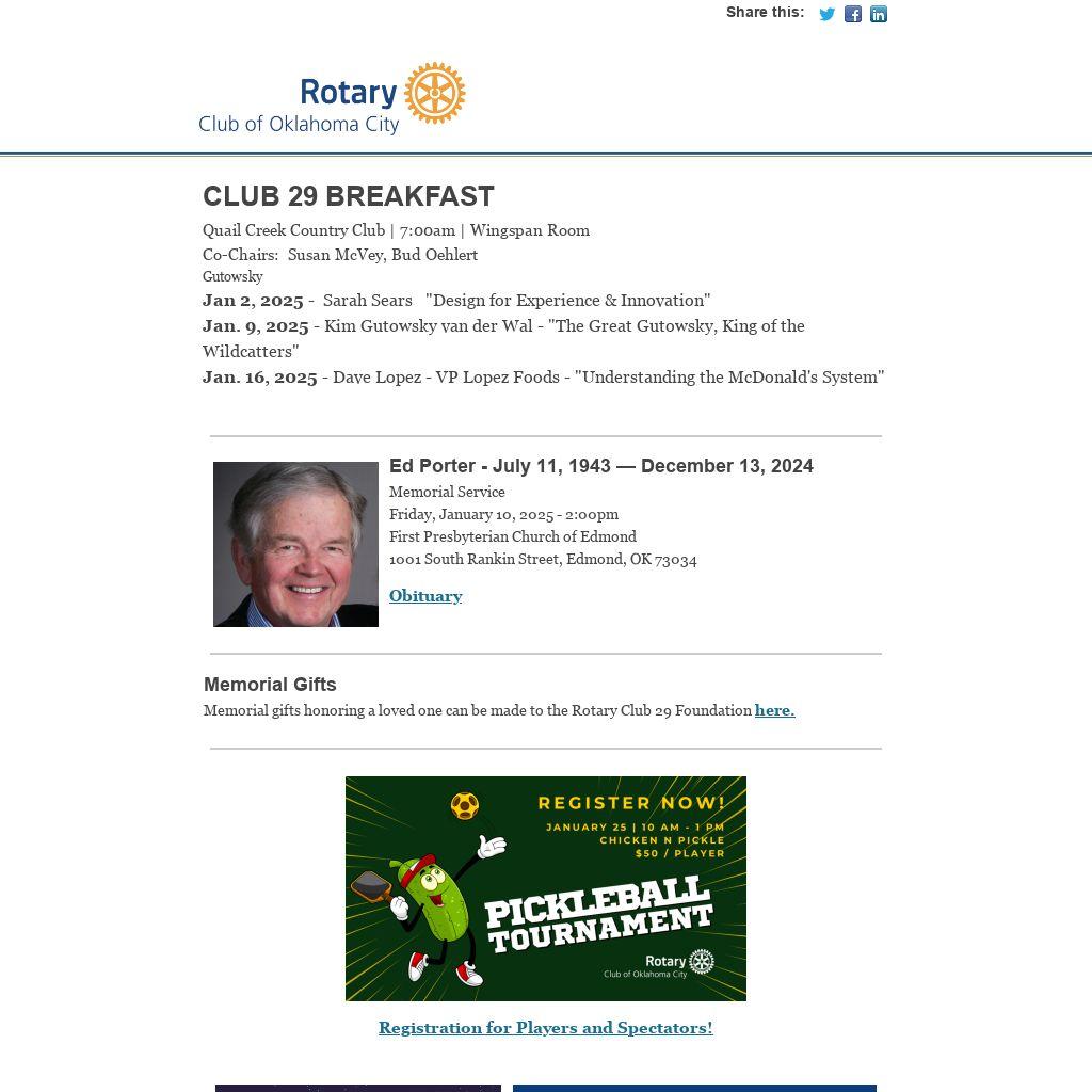 January 7, 2025 - Winter Party - RSVP Required January 25, 2025 - Pickleball Tournament - Chicken 'n Pickle 10-1 April 23, 2025 - Rotary Club of Okla. City visits Rotary Club of Tulsa