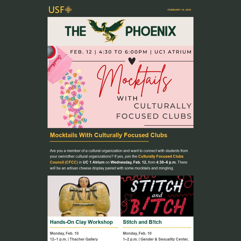 The Phoenix is a weekly e-newsletter sent by Student Leadership and Engagement to help students stay connected and get involved. It features campus events, leadership opportunities, athletic games, workshops, retreats, and more. Why “The Phoenix” title? The Phoenix has long been associated with the history and growth of USF as well as St. Ignatius, who encouraged followers to “go forth and set the world on fire.” Learn more »
