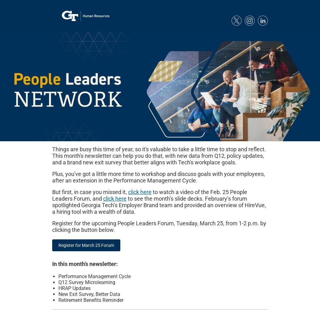 But first, in case you missed it, click here to watch a video of the Feb. 25 People Leaders Forum, and click here to see the month’s slide decks. February’s forum spotlighted Georgia Tech’s Employer Brand team and provided an overview of HireVue, a hiring tool with a wealth of data.