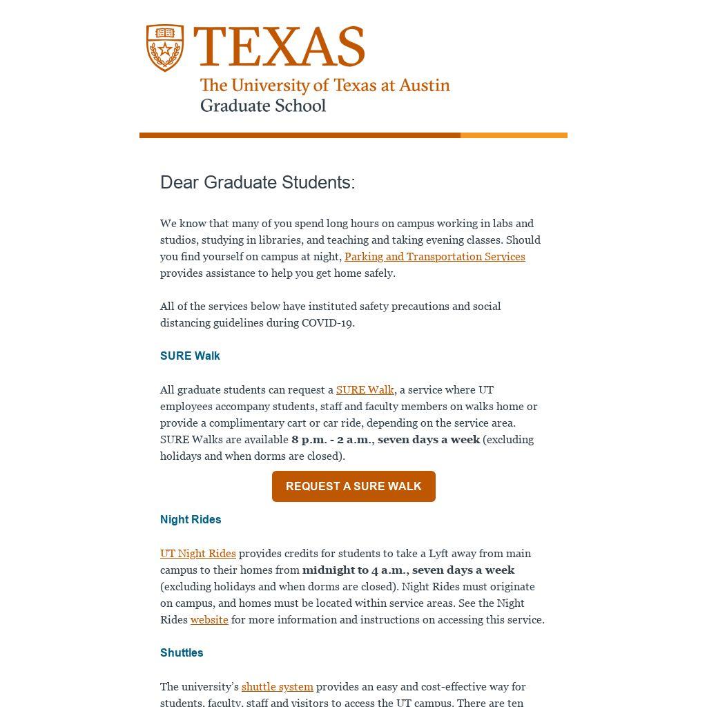 All graduate students can request a SURE Walk, a service where UT employees accompany students, staff and faculty members on walks home or provide a complimentary cart or car ride, depending on the service area. SURE Walks are available 8 p.m. - 2 a.m., seven days a week (excluding holidays and when dorms are closed).