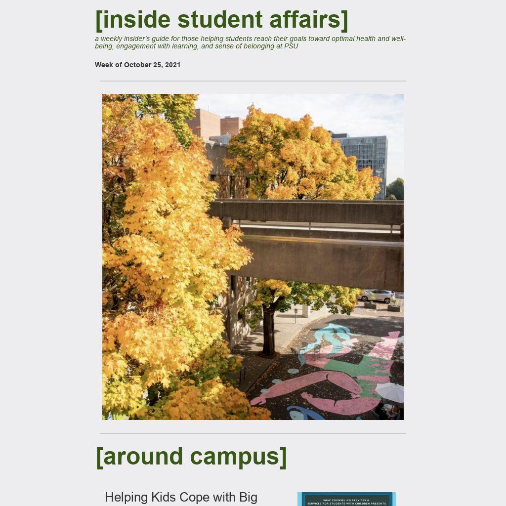 [inside student affairs]a weekly insider’s guide for those helping students reach their goals toward optimal health and well-being, engagement with learning, and sense of belonging at PSU