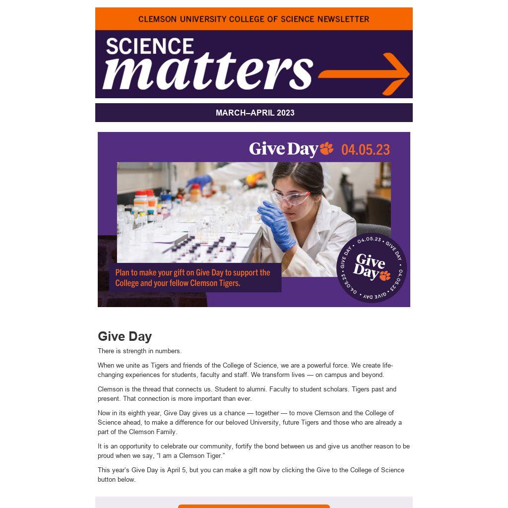 Now in its eighth year, Give Day gives us a chance — together — to move Clemson and the College of Science ahead, to make a difference for our beloved University, future Tigers and those who are already a part of the Clemson Family.