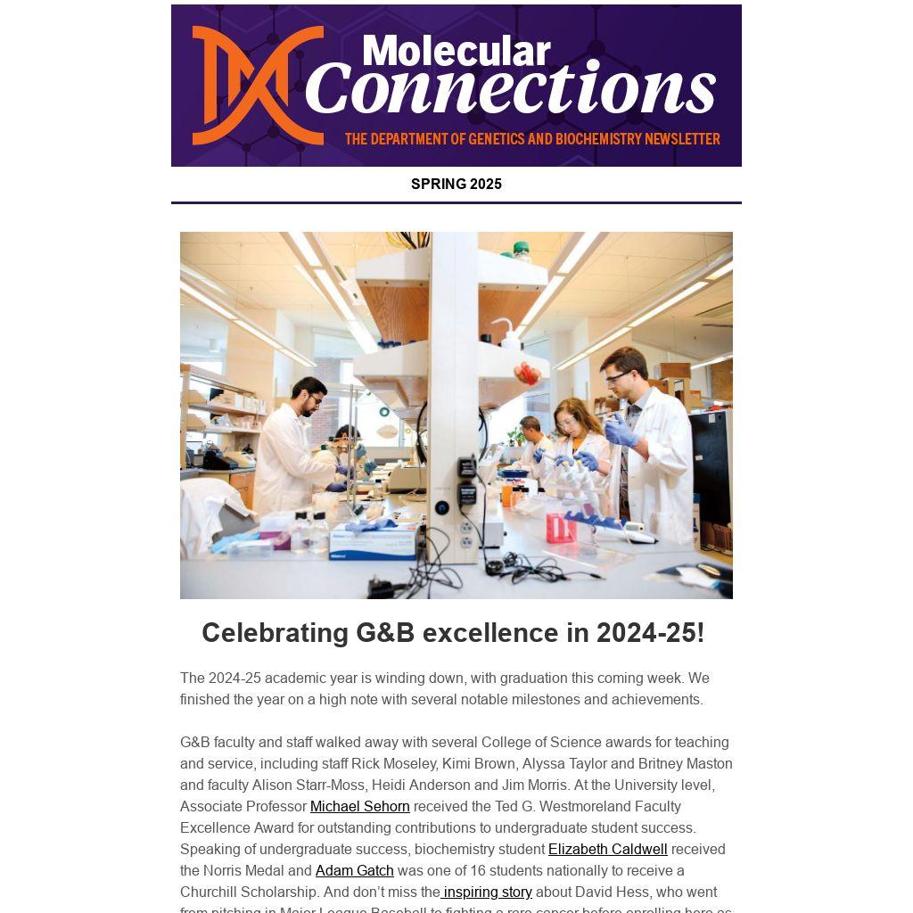 G&B faculty and staff walked away with several College of Science awards for teaching and service, including staff Rick Moseley, Kimi Brown, Alyssa Taylor and Britney Maston and faculty Alison Starr-Moss, Heidi Anderson and Jim Morris. At the University level, Associate Professor Michael Sehorn received the Ted G. Westmoreland Faculty Excellence Award for outstanding contributions to undergraduate student success. Speaking of undergraduate success, biochemistry student Elizabeth Caldwell received the Norris Medal and Adam Gatch was one of 16 students nationally to receive a Churchill Scholarship. And don’t miss the inspiring story about David Hess, who went from pitching in Major League Baseball to fighting a rare cancer before enrolling here as a biochemistry student.