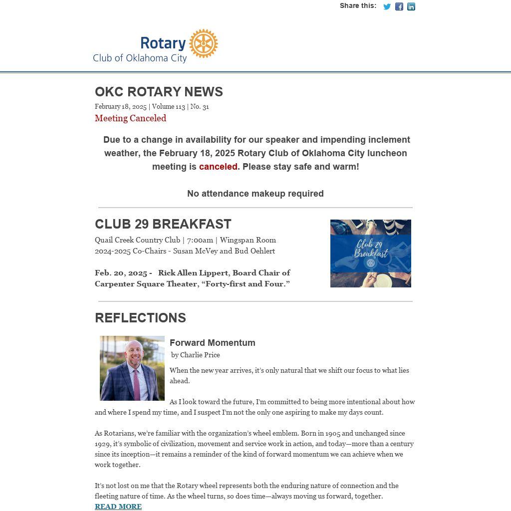 Due to a change in availability for our speaker and impending inclement weather, the February 18, 2025 Rotary Club of Oklahoma City luncheon meeting is canceled. Please stay safe and warm!