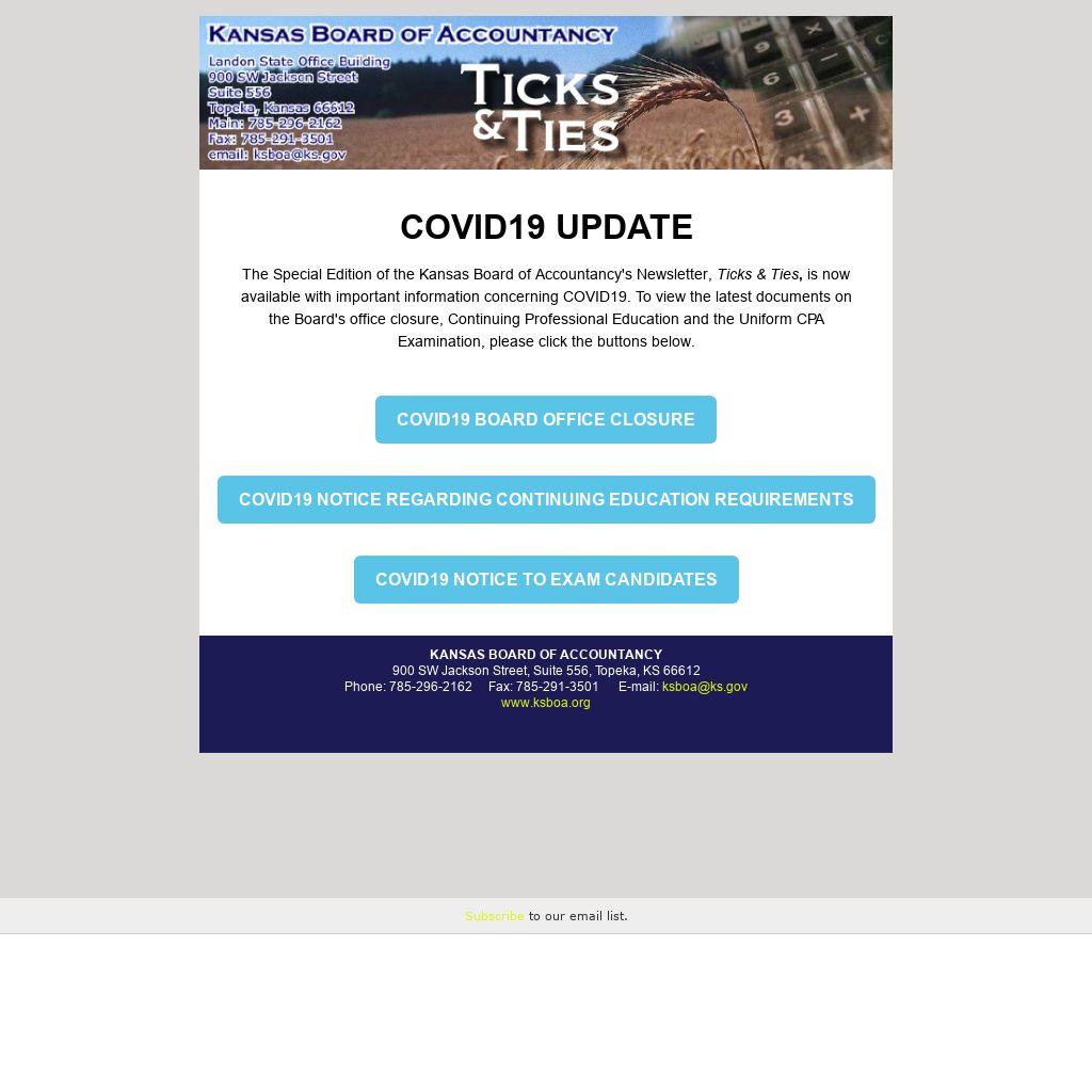 The Special Edition of the Kansas Board of Accountancy's Newsletter, Ticks & Ties, is now available with important information concerning COVID19. To view the latest documents on the Board's office closure, Continuing Professional Education and the Uniform CPA Examination, please click the buttons below.