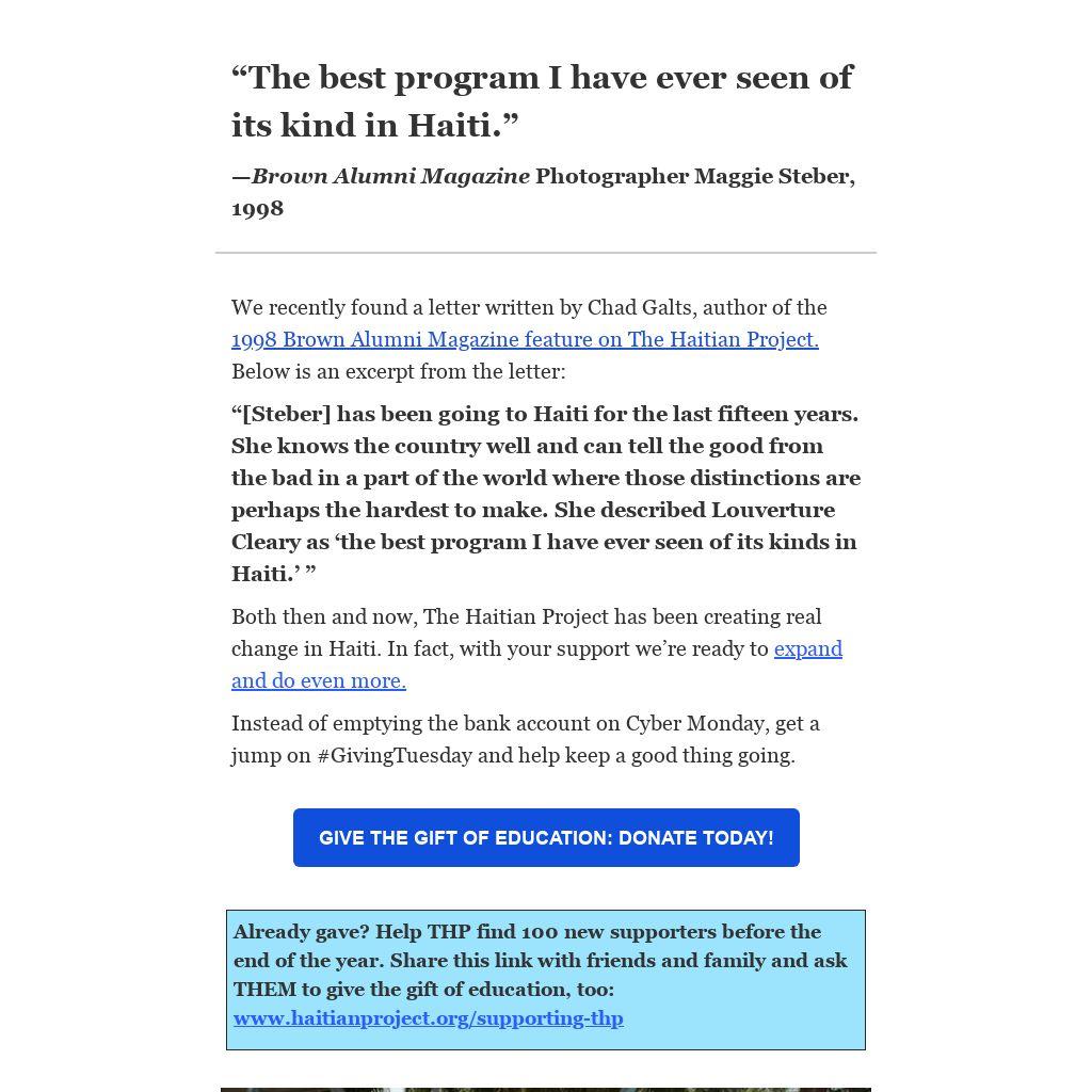 Already gave? Help THP find 100 new supporters before the end of the year. Share this link with friends and family and ask THEM to give the gift of education, too: www.haitianproject.org/supporting-thp