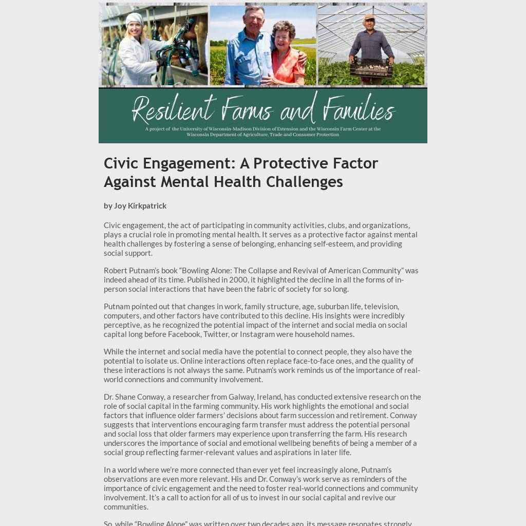 In a world where we’re more connected than ever yet feel increasingly alone, Putnam’s observations are even more relevant. His and Dr. Conway’s work serve as reminders of the importance of civic engagement and the need to foster real-world connections and community involvement. It’s a call to action for all of us to invest in our social capital and revive our communities.