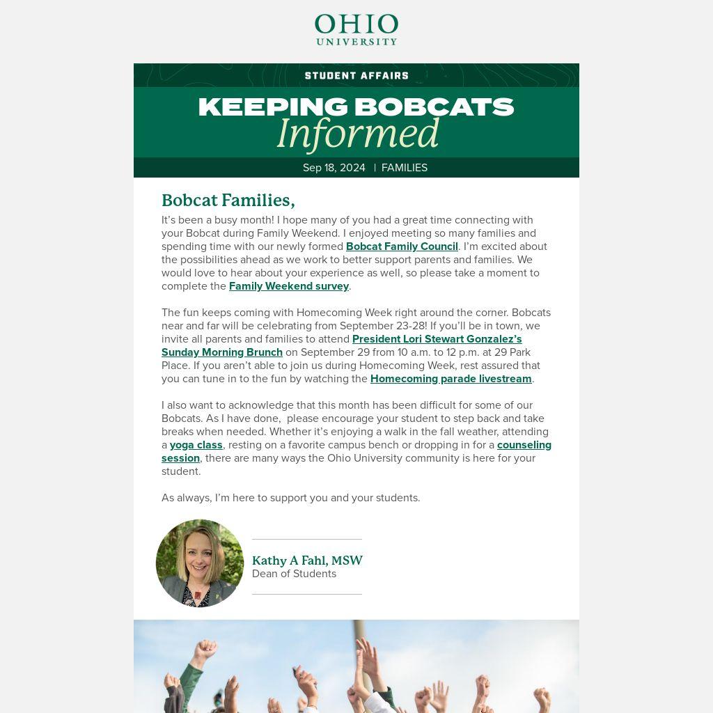It’s been a busy month! I hope many of you had a great time connecting with your Bobcat during Family Weekend. I enjoyed meeting so many families and spending time with our newly formed Bobcat Family Council. I’m excited about the possibilities ahead as we work to better support parents and families. We would love to hear about your experience as well, so please take a moment to complete the Family Weekend survey.