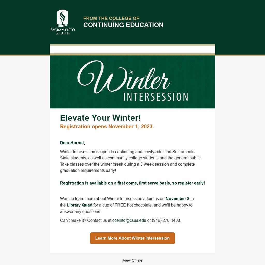 Winter Intersession is open to continuing and newly-admitted Sacramento State students, as well as community college students and the general public. Take classes over the winter break during a 3-week session and complete graduation requirements early!