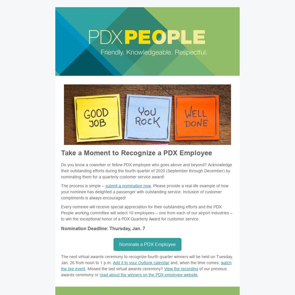 Do you know a coworker or fellow PDX employee who goes above and beyond? Acknowledge their outstanding efforts during the fourth quarter of 2020 (September through December) by nominating them for a quarterly customer service award!