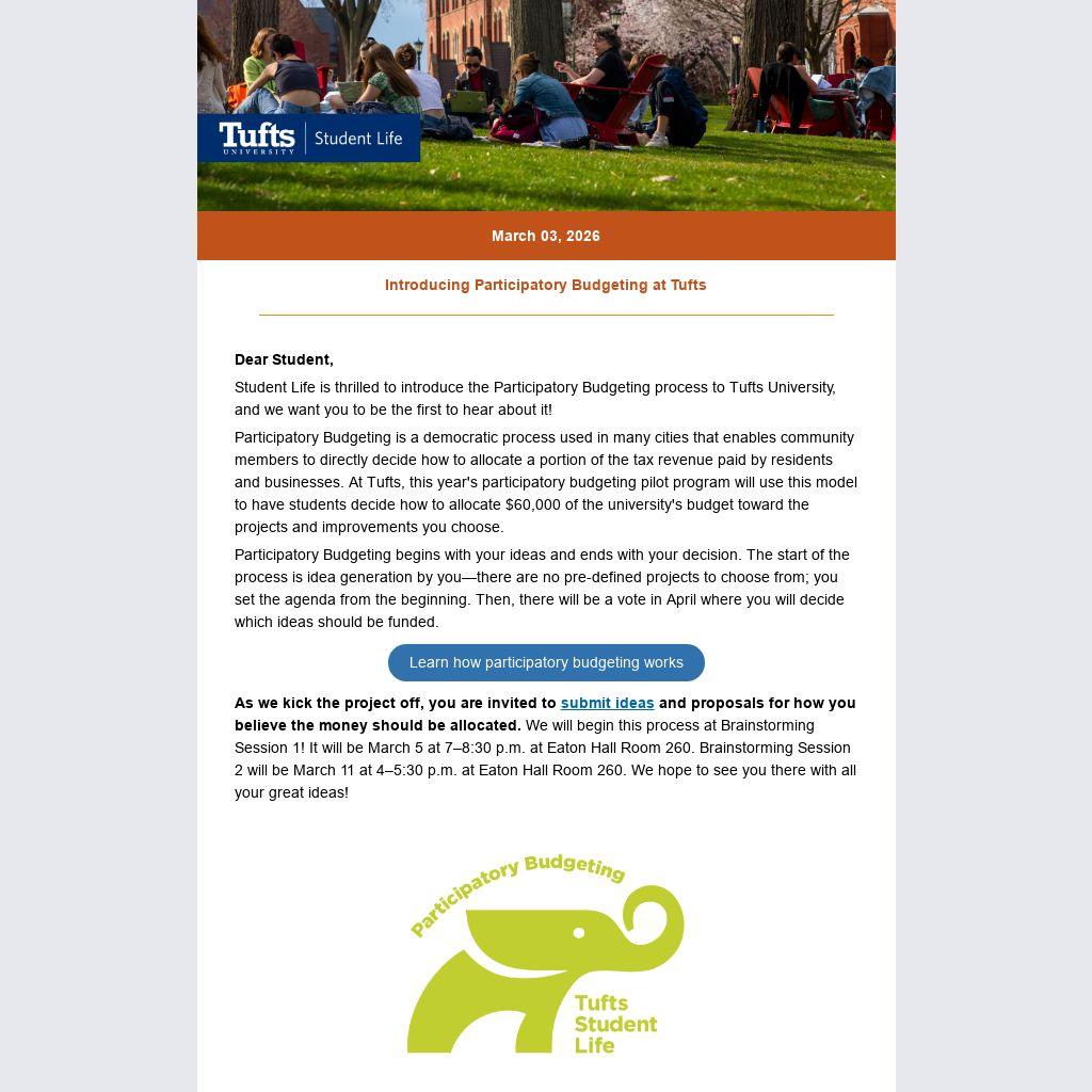 Participatory Budgeting is a democratic process used in many cities that enables community members to directly decide how to allocate a portion of the tax revenue paid by residents and businesses. At Tufts, this year's participatory budgeting pilot program will use this model to have students decide how to allocate $60,000 of the university's budget toward the projects and improvements you choose.