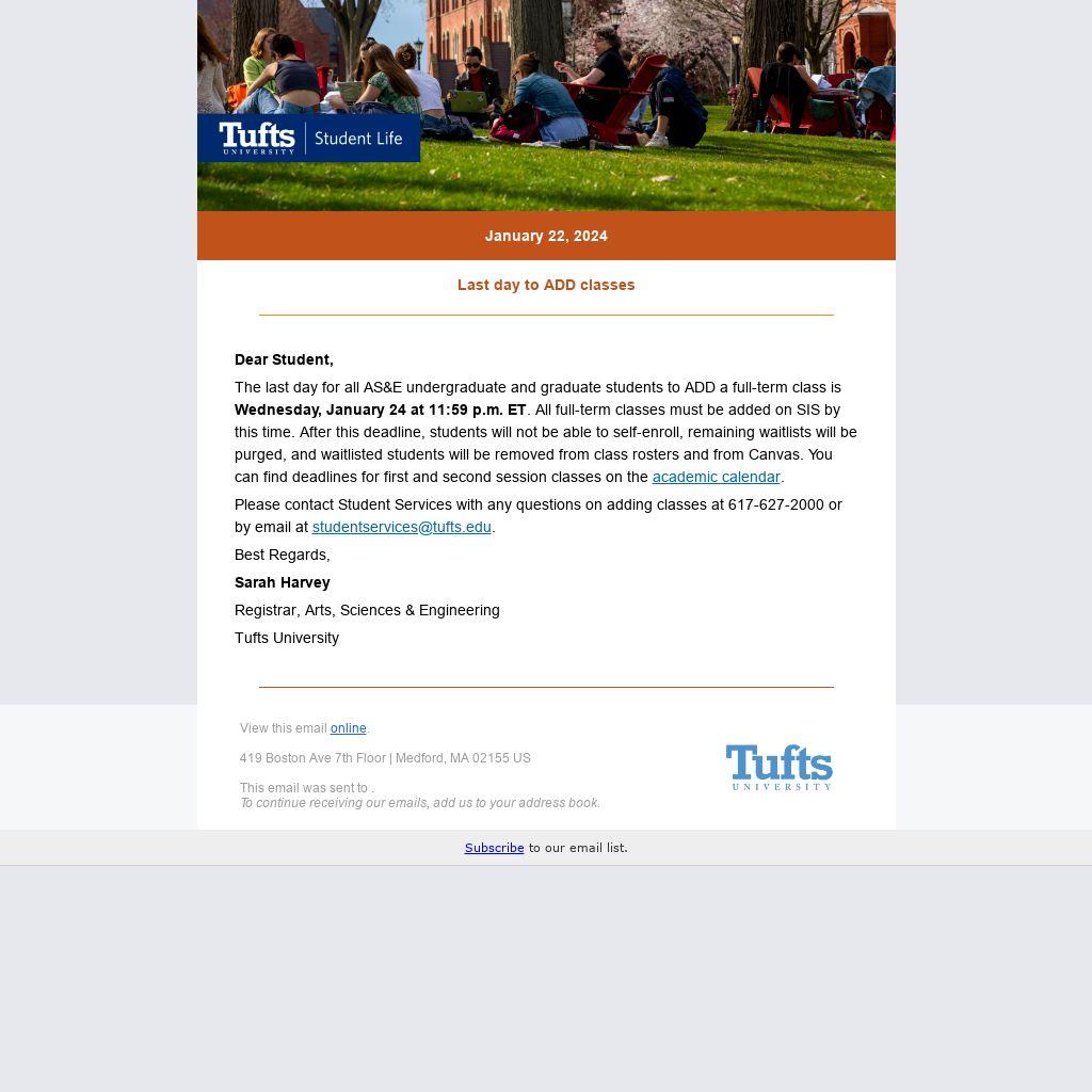 The last day for all AS&E undergraduate and graduate students to ADD a full-term class is Wednesday, January 24 at 11:59 p.m. ET. All full-term classes must be added on SIS by this time. After this deadline, students will not be able to self-enroll, remaining waitlists will be purged, and waitlisted students will be removed from class rosters and from Canvas. You can find deadlines for first and second session classes on the academic calendar.