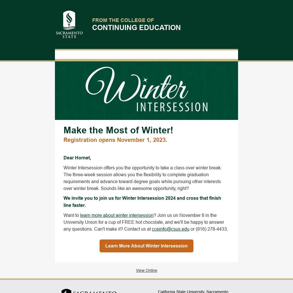 Winter Intersession offers you the opportunity to take a class over winter break. The three-week session allows you the flexibility to complete graduation requirements and advance toward degree goals while pursuing other interests over winter break. Sounds like an awesome opportunity, right?