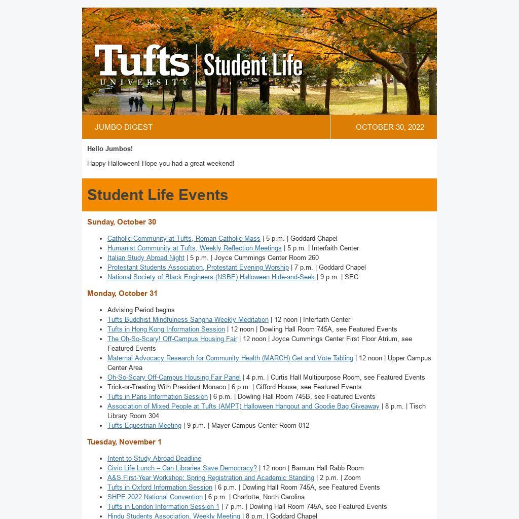 Students and Student Organizations can submit events to JumboLife by Thursdays at 12 noon and we'll include them in the Jumbo Digest!