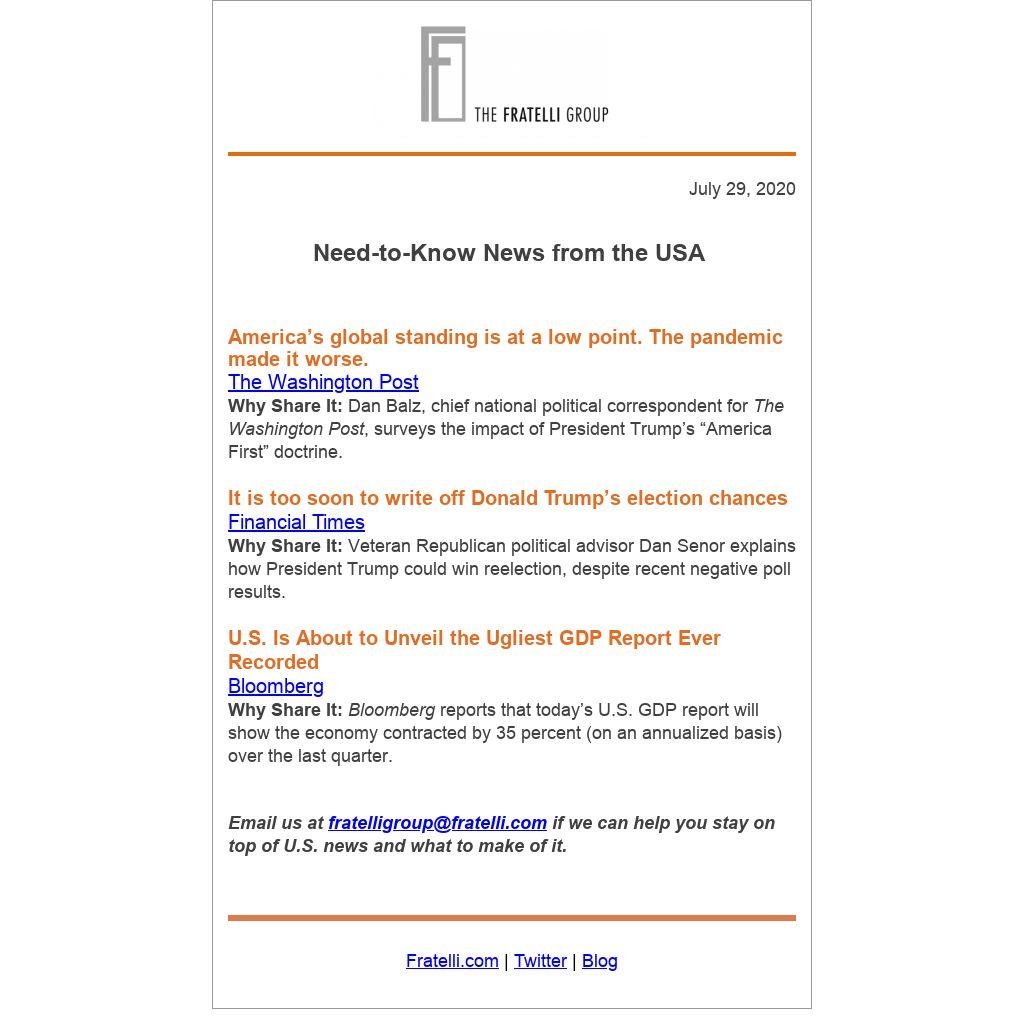 Why Share It: Bloomberg reports that today’s U.S. GDP report will show the economy contracted by 35 percent (on an annualized basis) over the last quarter.
