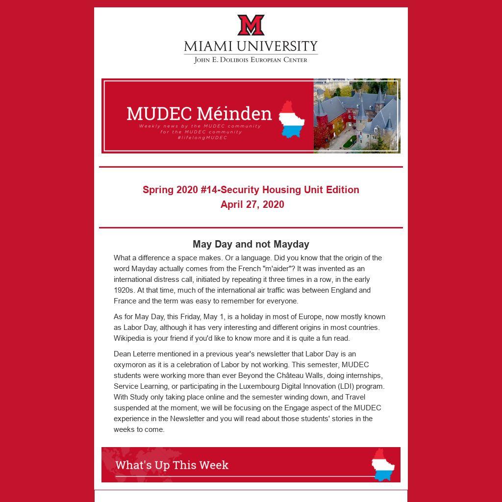 Dean Leterre mentioned in a previous year's newsletter that Labor Day is an oxymoron as it is a celebration of Labor by not working. This semester, MUDEC students were working more than ever Beyond the Château Walls, doing internships, Service Learning, or participating in the Luxembourg Digital Innovation (LDI) program. With Study only taking place online and the semester winding down, and Travel suspended at the moment, we will be focusing on the Engage aspect of the MUDEC experience in the Newsletter and you will read about those students' stories in the weeks to come.