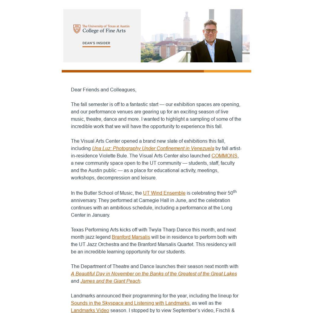 The College of Fine Arts is privileged to be in a city and university that values the arts and embraces all the different kinds and wealth of creative expressions that abound in our community. I’m energized and heartened by all that’s in store in the coming year.