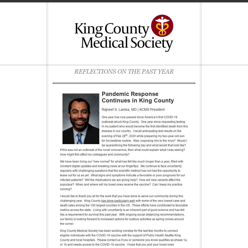 King County Medical Society has been working nonstop for the last few months to connect eligible individuals with the COVID-19 vaccine with the support of Public Health Seattle King County and local hospitals. Please contact us if you or someone you know qualifies as phase 1a or 1b and needs access to the COVID-19 vaccine. I hope that you and your loved ones are staying well, finding ways to cope, contribute, and relax as we eagerly look toward a resolution to this ongoing crisis.